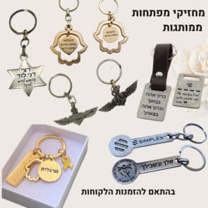לוגו/בהקדשה/שם או כל כיתוב שתבקשו, יבוצע בחריטה או ביציקה בכמויות סיטונאיות או בבודדים על גבי מוצרים שונים כמו מחזיקי מפתחות, מדליות, צמידים, סיכות, שרשראות ועוד. מתאים כמתנות לתלמידים סופשנה,מזכרות אישיות
