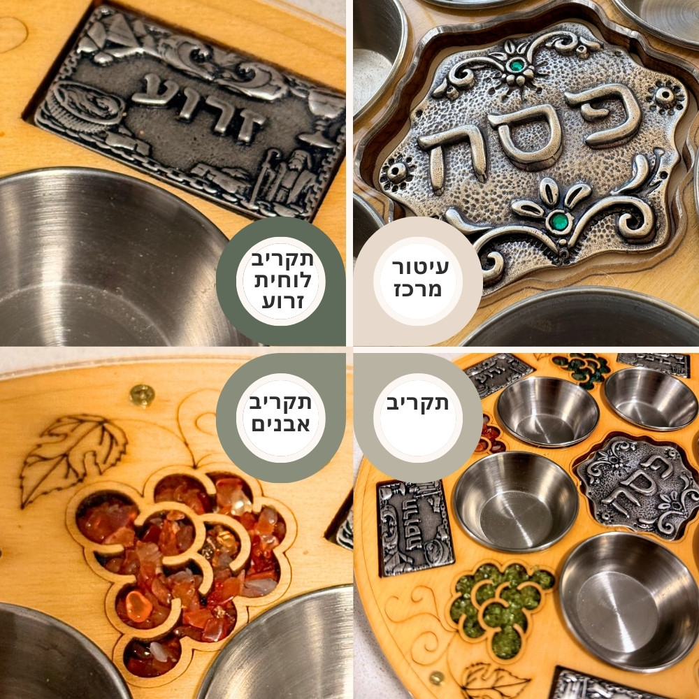הקערה עשויה עץ צפצפה טבעי, בגוון חמים ונעים לעין. החריטות העדינות מקיפות את פני השטח, מדמות גפנים ומעניקות עומק ואופי. במרכז משולב עיטור מתכת עגול ובולט, עליו מופיעים שמות סימני הסדר. סביבם משולבים אלמנטים ממתכת בציפוי כסף 925 ועליהם סממנים מסיפור של יציאת מצרים – מצות, ים סוף, תיבת משה, פירמידות וסמלים נוספים.